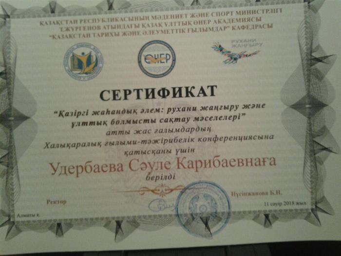 Certificate for participation in the International Scientific and Practical Conference of the teacher Uderbaeva Saule Karibaevna |
