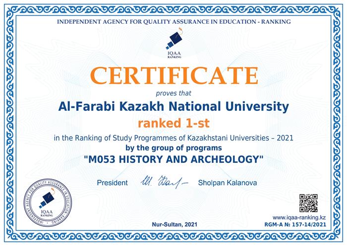 Al-Farabi KazNU ranked 1-st in the Ranking of Study Programmes of Kazakhstan Universities by the group of programs "M053 History and archeology" |