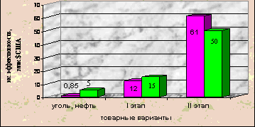 The technical and economic significatives of the first and second stages show (fig. 1) that economic effect in amounts of 12 million US dollars for coal and 15 million for petroleum per year will be reached as the result of the creation of petrochemical production of the mentioned productivity.