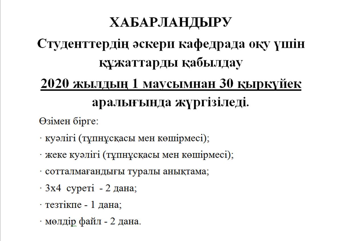 31.03.2020Әл-Фараби атындағы ҚазҰУ ректоры академик Ғ. М. Мұтановтың карантин жағдайында студенттерді қашықтықтан оқытуды нақты ұйымдастыру туралы нұсқауларына сәйкес, университеттің әскери кафедрасында студенттерді қашықтықтан оқыту мәселелерін шешу бойынша жоспарлы және мақсатты жұмыстар ұйымдастырылды.