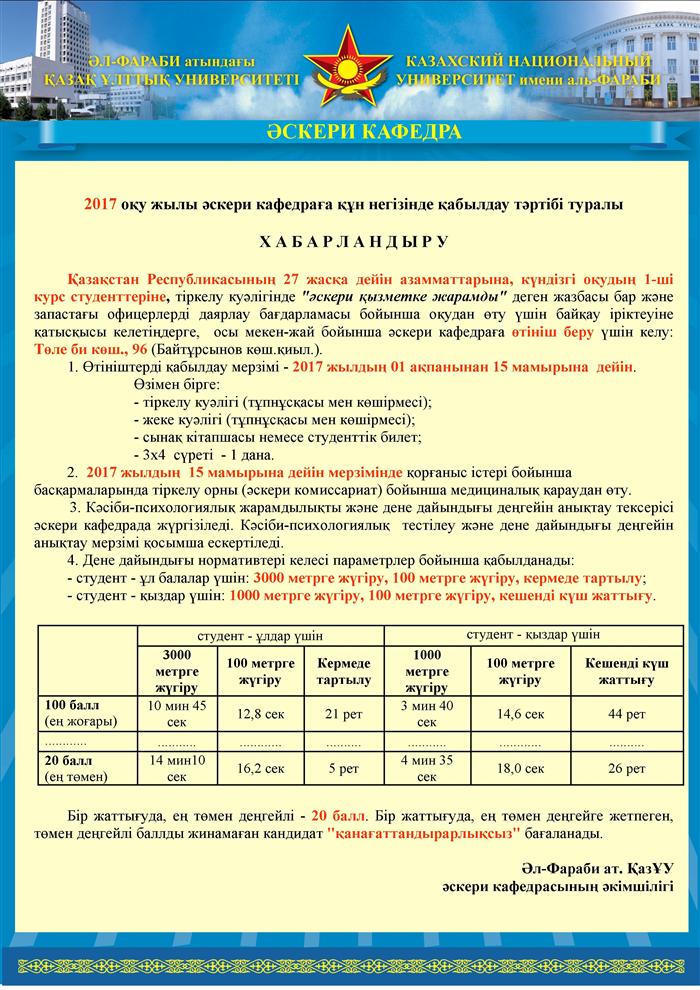 2017 оқу жылы әскери кафедраға құн негізінде қабылдау тәртібі туралы