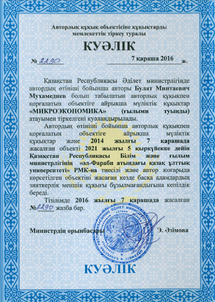 Б.М. Мухамедиевтың авторлық құқық "Микроэкономика" объектісіне құқықтарды мемлекеттік тіркеу туралы куәлік |