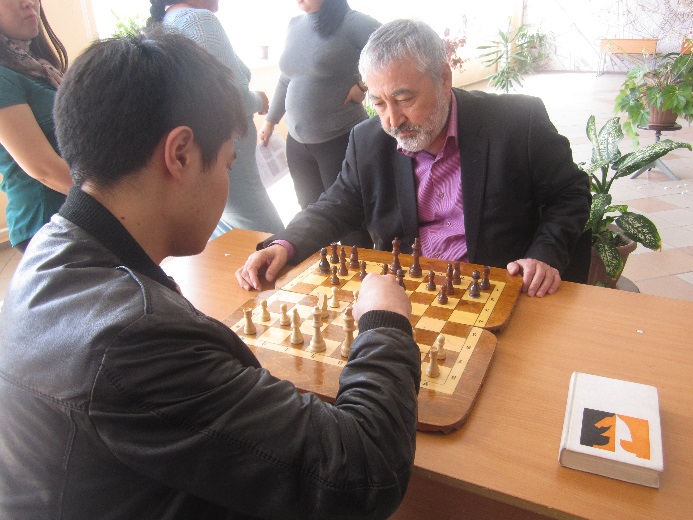Студенттер мен іргелі математика кафедрасының оқытушылары (Кангужин Б.Е., Нұрпейіс Ж., Рзаева Г.К., Мейрембеков К.А., Кунгожин А.М.) арасында шахмат ойынынан жарыс.