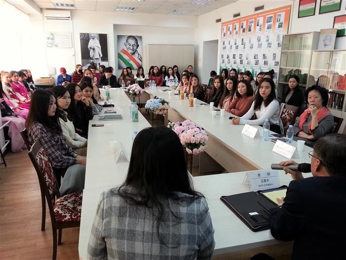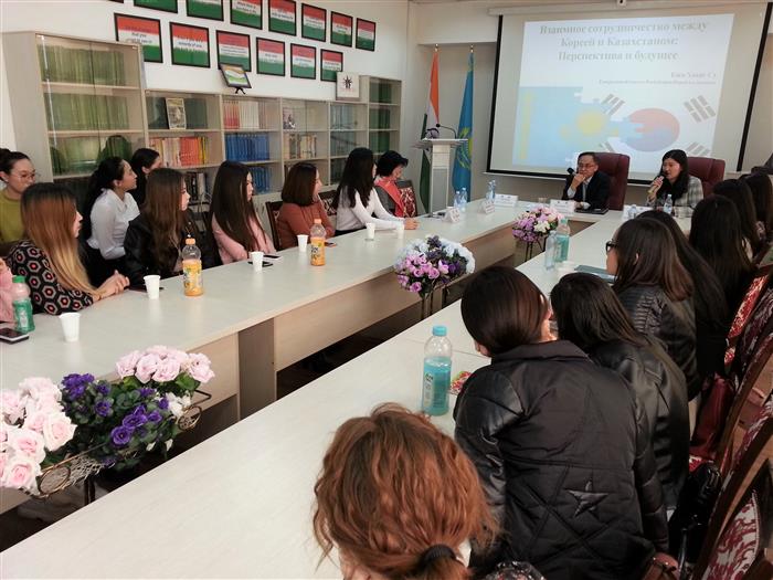 Бас консул студенттер мен кафедра оқытушыларына «Қазақстан мен Корея арасындағы өзара ынтымақтастық» тақырыбында дәріс оқып, екі ел арасындағы достық қарым-қатынастар туралы нақты ақпараттарды ұсынды. Жоғары курс студенттері де, төменгі курс студенттері де Бас консулдың дәрісіне үлкен қызығушылық танытып, өздерін толғантқан мәселелер бойынша сұрақтарын қойды. Kim Heung-soo мырза барлық курс студенттерінің корей тілі деңгейін өте жоғары бағалады.