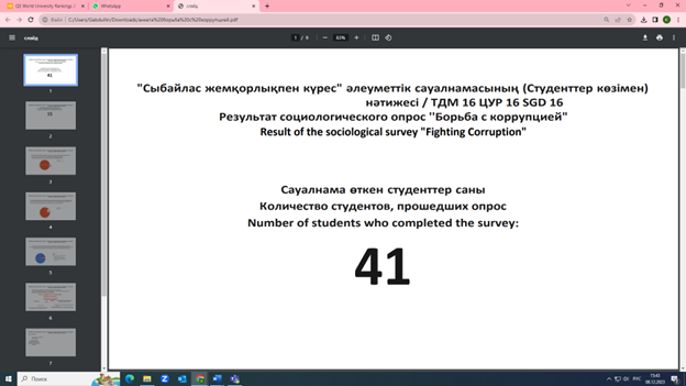 "Сыбайлас жемқорлықпен күрес" әлеуметтік сауалнамасының (Студенттер көзімен) нәтижесі / TДМ 16 ЦУР 16 SGD 16 Түрксой кафедрада