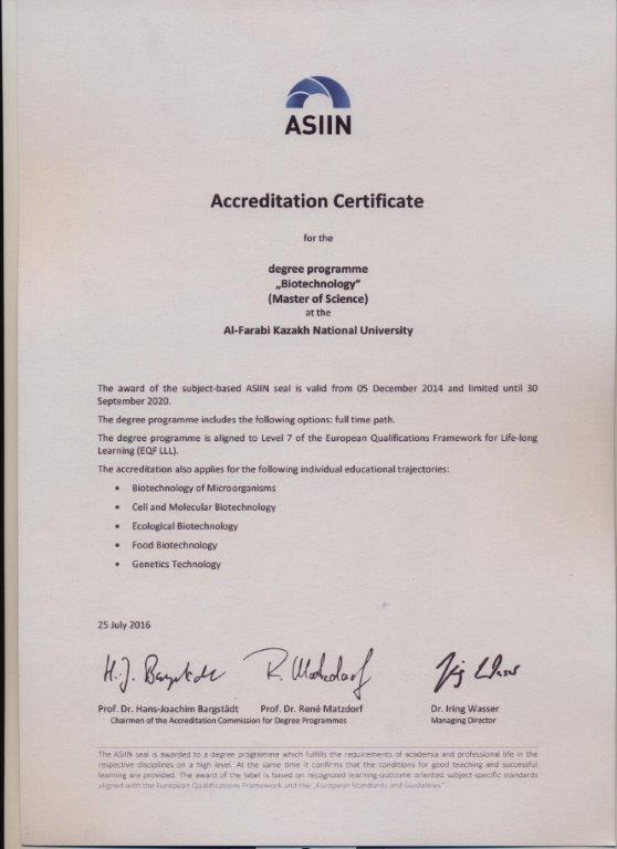 "Биотехнология" мамандығы бакалавриат, магистратуреа мен докторантура бойынша халықаралық ASIIN аккредитация өтіп, лайықты куәліктерге ие болды. |