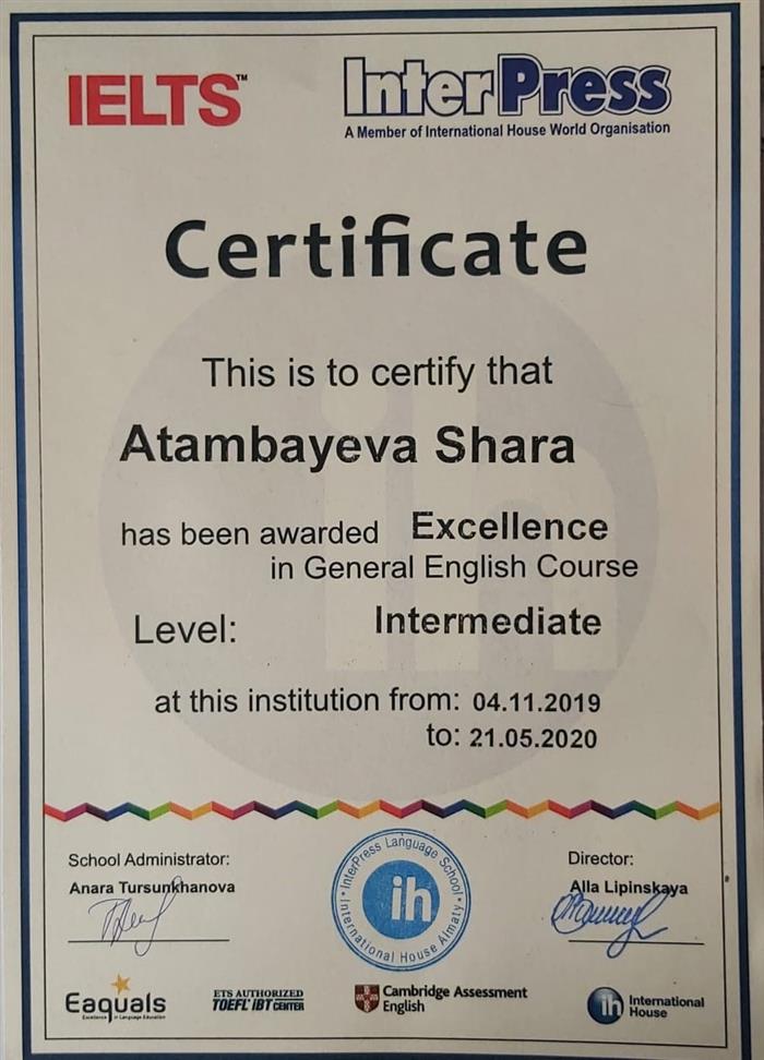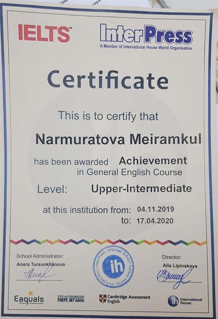 IELTS INTERPRESS КУӘЛІК Жалпы ағылшын тілі курсының үздігі марапатталды Деңгей: Upper-Intermediate