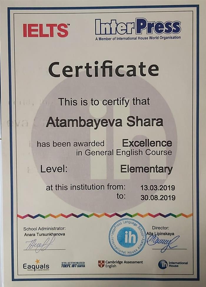 IELTS INTERPRESS КУӘЛІК Жалпы ағылшын тілі курсының үздігі марапатталды Деңгей: Elementary