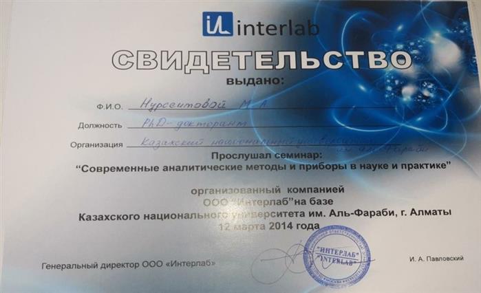 Interlab сертификаты «Ғылым мен практикадағы заманауи аналитикалық әдістер мен құрылғылар»