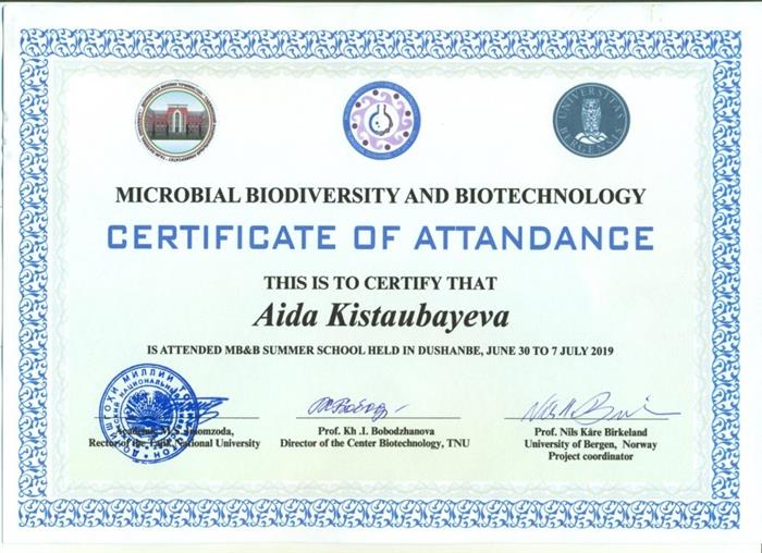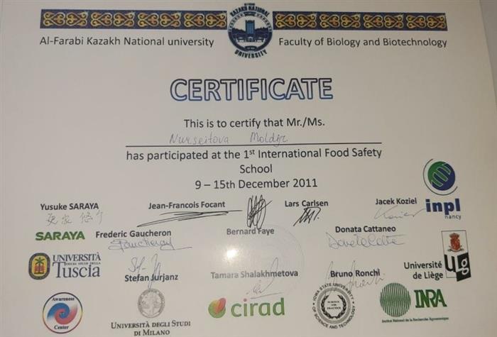 КУӘЛІК Бұл Нұрсейітова М-дің 1-ші Халықаралық азық-түлік қауіпсіздігі мектебіне қатысқандығын растау |