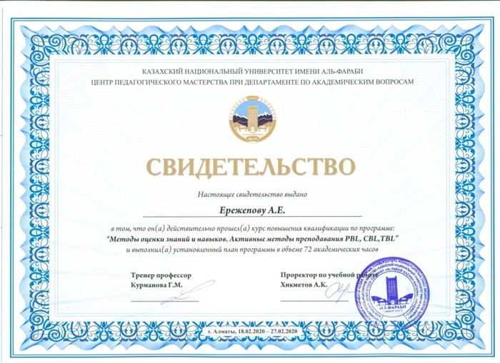 Оқу ісі департаментіне қарасты әл-Фараби атындағы ҚазҰУ педагогикалық шеберлік орталығы Сертификат «Білім мен дағдыларды бағалау әдістері. Оқытудың белсенді әдістері PBL, CBL, TBL |