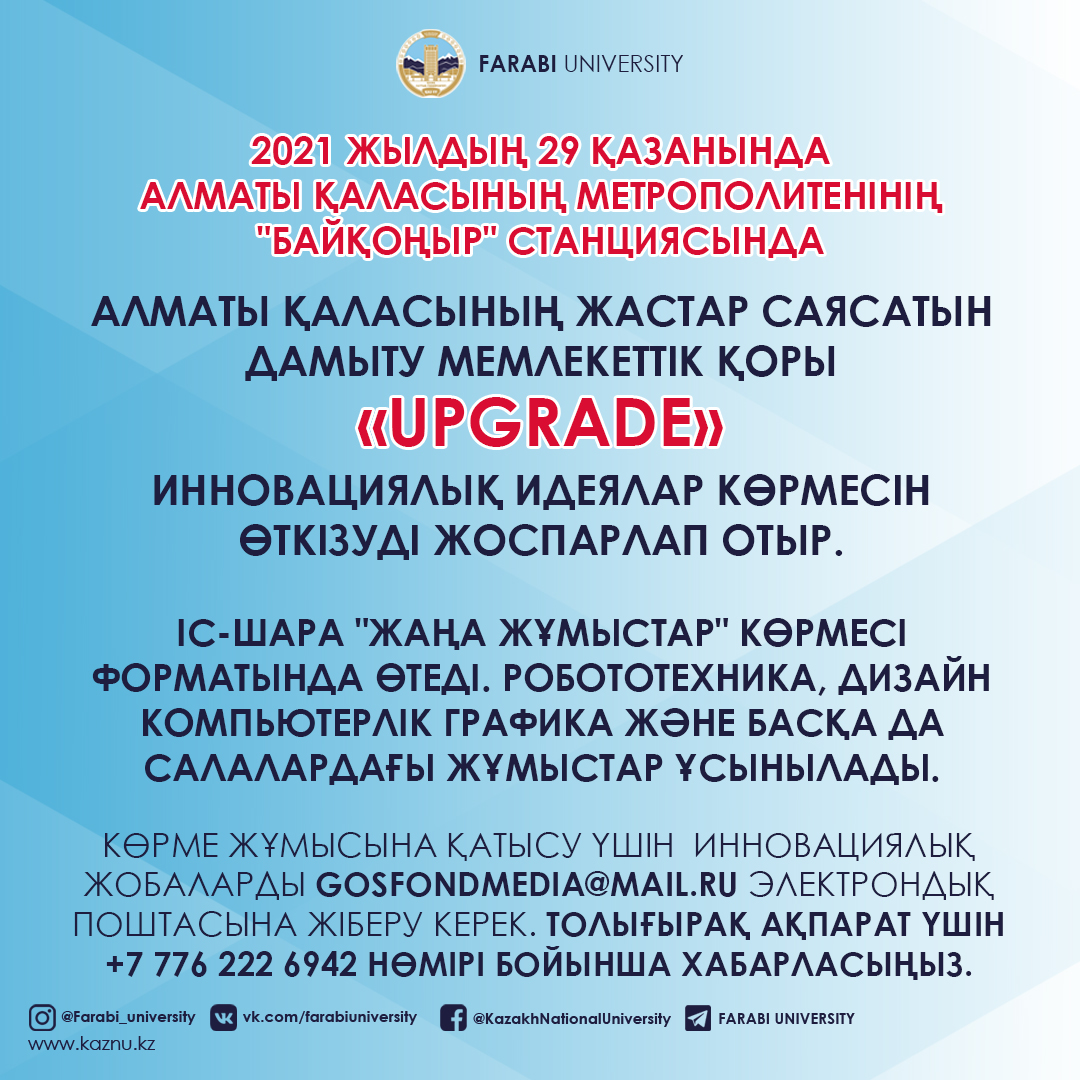 2021 жылдың 29 қазанында Алматы қаласының метрополитенінің "Байқоңыр" станциясында Алматы қаласының жастар саясатын дамыту мемлекеттік қоры "UpGrade" инновациялық идеялар көрмесін өткізуді жоспарлап отыр.
