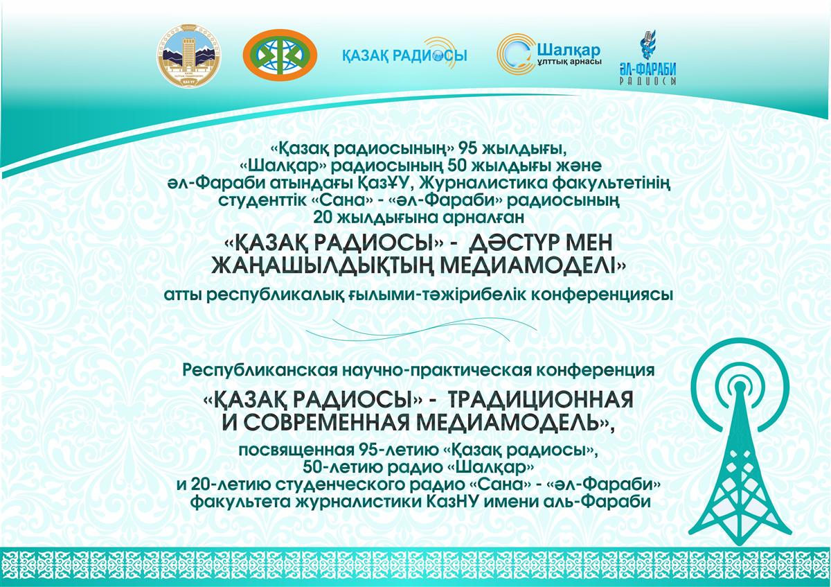Әл-Фараби атындағы ҚазҰУ, Журналистика факультеті, Баспасөз және электронды БАҚ кафедрасының ұйымдастыруымен "Қазақ радиосының" 95 жылдығы, "Шалқар" радиосының 50 жылдығы және әл-Фараби атындағы ҚазҰУ, Журналистика факультетінің студенттік "Сана" - "әл-Фараби" радиосының 20 жылдығына арналған "Қазақ радиосы" - дәстүр мен жаңашылдықтың медиамоделі" атты республикалық ғылыми- тәжірибелік конференциясын өткізеді.