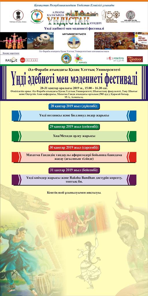 Шығыстану факультетінің Таяу Шығыс және Оңтүстік Азия кафедрасы Қазақстандағы Үндістан Республикасының Елшілігімен бірлесе, Үндістан Республикасының 70-жылдығы және Махатма Гандидің 150 жылдық мерейтойы аясында Алматы қаласында 2019 жылдың 28-31 қаңтар аралығында «Үндістан күндері» фестивалін өткізеді.