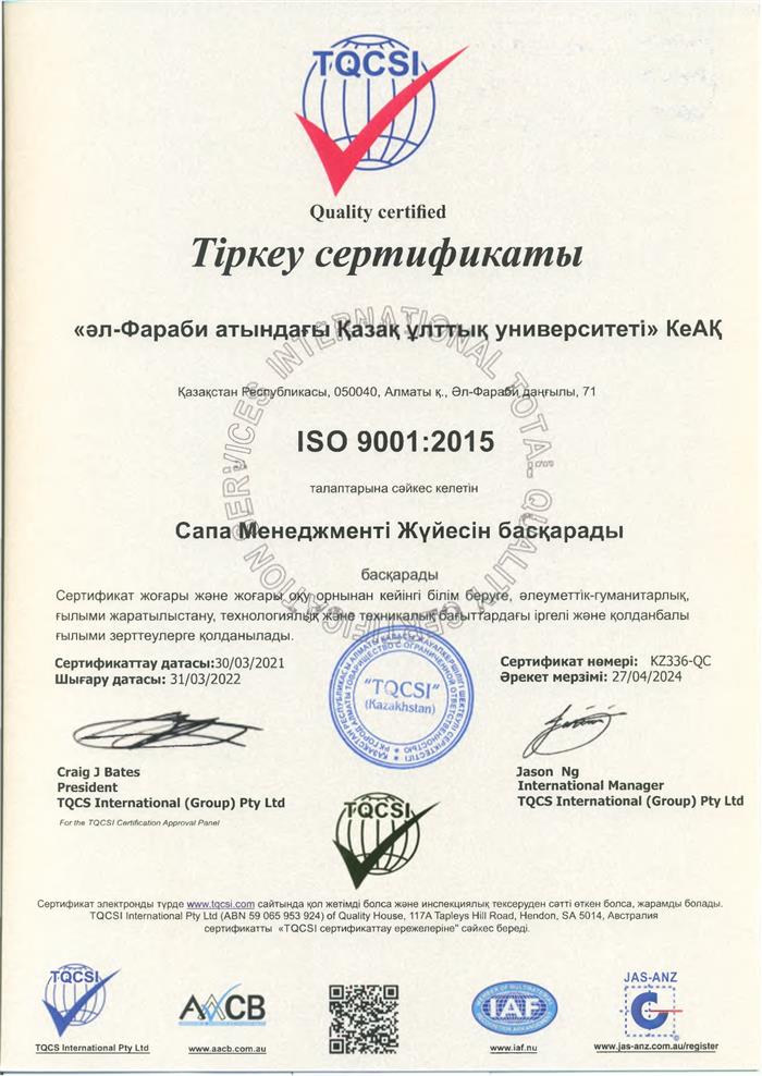 2022 жылы ресертификаттау аудитінің нәтижесі бойынша «Әл-Фараби атындағы ҚазҰУ» КеАҚ университеттің сапа менеджменті жүйесінің халықаралық ISO 9001:2015 стандартына сәйкестігін дәлелдейтін «TQCS International» ұйымының халықаралық сертификатын алды.