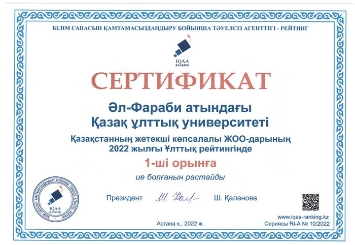 Академиялық рейтинг және үздіктер обсерваториясы (IREG) аккредиттеген Аккредиттеу және рейтингтің тәуелсіз агенттігі (АРТА) жүргізген Қазақстан Республикасының танымал университеттерінің 2022 жылғы ұлттық рейтингінің қорытындысы бойынша Әл-Фараби атындағы ҚазҰУ басқа ұлттық университеттер арасында ең көп ұпай жинаған бірінші және үздік университет болып танылды. Университетіміздің осы рейтингтегі серпілісінің айрықша белгісі әлемдік индекстелген Q1-Q2 журналдарындағы ғылыми жарияланымдар санының артуы, сонымен қатар әл-Фараби атындағы ҚазҰУ-дың ғылыми жұмыстарының нәтижелеріне сұраныс пен ғылыми зерттеулердің тиімділігін айғақтайтын университет ғалымдарының көрсеткіштілігі.