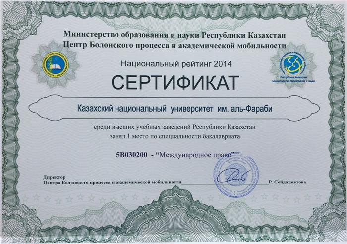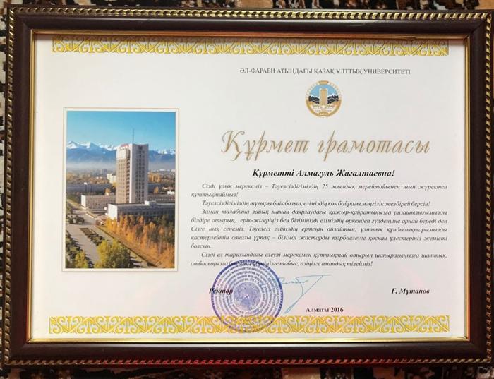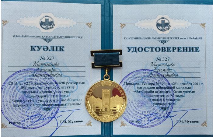Ректордың 2022 жылғы 20 қазан №149 бұйрығына сәйкес, заң ғылымдарының кандидаты, доцент Сайрамбаева Жұлдыз Талғатқызы әл-Фараби атындағы Қазақ ұлттық университетінің "Ерен еңбегі үшін" медалімен марапатталды |