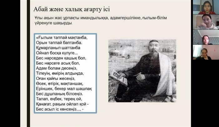 Абай – ақын, Абай – дана. Қазақтың ортақ мақтанышына айналған халқымыздың ұлы перзенті, ақын, философ, ғұлама Абай Құнанбайұлының туғанына 175 жыл толуына орай "Шетел тілі: екі шетел тілі" мамандығының 3 курс студенттері ашық сабағын жоғарғы деңгейде өткізді! Абай өз ғұмырының ақырына дейін қазақ балаларын оқуға, білім-ғылыммен айналысуға, рухани дамуға және әлемдік мәдениеттің құндылықтарын бойға жинауға шақырғанын білеміз. Дана ақын келер ұрпақты «жүрегімнің қуаты, перзенттерім» деп бағалайды. Айтылған сөз, жазылған жауһар ойлар бірінші кезекте қазіргі жастарға бағытталады. Жат мінез-құлықтан аулақ болудың нақты жолдарын меңзейді. Абай Құнанбаевтың мерейтойы халықаралық деңгейде, оның ішінде ЮНЕСКО шеңберінде атап өтілетін болады. Бұл-біздің еліміз үшін де, барша қазақстандықтар үшін де үлкен мақтаныш. Абай есімі жаңа Қазақстанның брендіне айналуы керек, сондықтан оның шығармаларын біздің елден тыс жерлерде де кеңінен насихаттау қажет. |