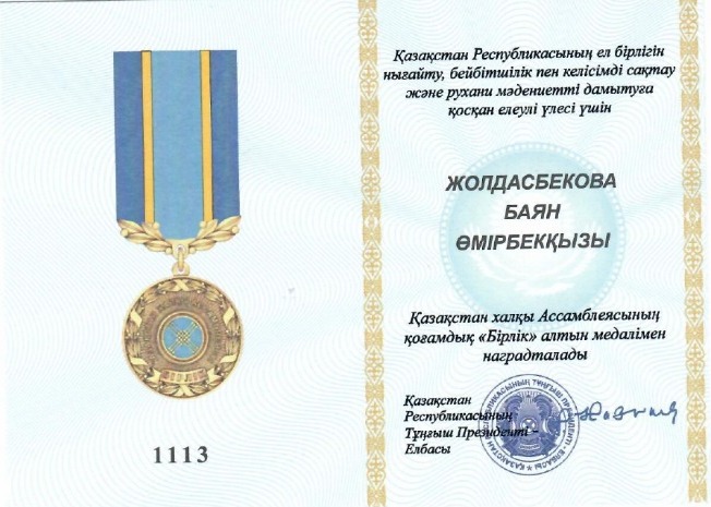 Әл-Фараби атындағы ҚазҰУ филология факультетінің деканы, филология ғылымдарының докторы, профессор, ҚР ҰҒА корреспондент мүшесі Баян Өмірбекқызы Жолдасбекова мәдениетаралық диалогты, азаматтық бейбітшілік пен келісімді дамытуға, ұлттық мәдениеттер мен мемлекеттер арасындағы достық қатынастарды жақындастыруға және өзара байытуға қосқан үлесі үшін «Бірлік» алтын медалімен марапатталды. Марапаттау туралы бұйрыққа Елбасы Нұрсұлтан Назарбаев қол қойды. "Қазақстан халқының бірлігі" медалі ("Бірлік") - Қазақстан Республикасының мемлекеттік наградалары, бірлік пен тұрақтылықты нығайтудағы еңбегі үшін қазақстандық және шетелдік азаматтарды, ұйымдар мен кәсіпорындарды, азаматтық қоғам институттарын қоғамдық мойындау мен көтермелеудің жоғары белгісі. |