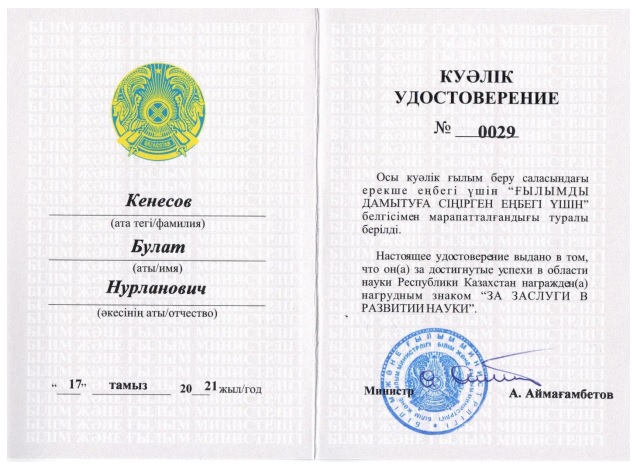 Кафедра профессоры, х.ғ.к. Кенесов Болат Нұрланұлы Қазақстан Республикасының ғылым саласындағы жетістіктері үшін «Ғылымды дамытуға сіңірген еңбегі үшін» белгісімен марапатталды. |
