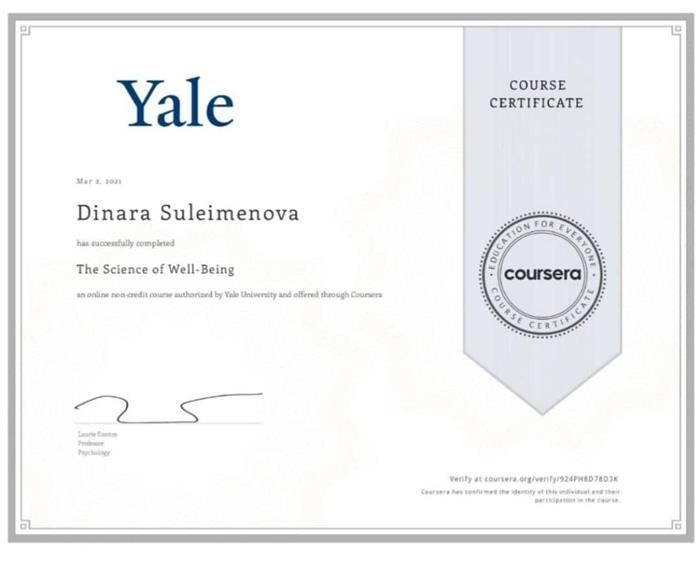 Сүлейменова Динара, биотехнология факультетінің 3 курс студенті, Йель университетінің Coursera платформасында әл-ауқат туралы онлайн курсынан өтті