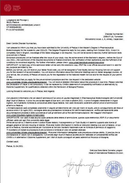 «Биотехнология» мамандығының 4-курс студенті Нұрмахан Жандар Италияның Падуа университетіне «Фармацевтикалық биотехнология» мамандығы бойынша магистратураға қабылданды