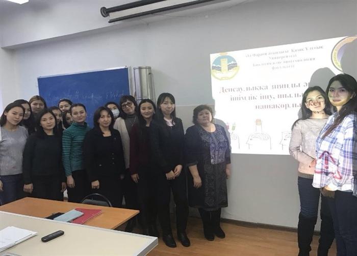 Іс-шара барысында Тулебаева Дамеля және Рахатқызы Ақбота студенттерге «Зиян әдеттер және олардың адам денсаулығына әсері» тақырыбында презентация көрсетіп, баяндама жасады. Баяндамада ішімдік, темекі, нашақорлық және олардың қауыптілігі жайлы айтылды. Содан кейін, олар студенттерге зиян әдеттердің тізімін жалғастыруды ұсынды. Студенттер басқа да зиян әдеттерді тізімге қосып, оларды сипаттады. Заманауи адамның денсаулығына әсер ететін көптеген зиян әдеттер бар екендігі анықталды: ойынқұмарлық, компьютер, жұйелі телефондар, фаст-фуд, күн тәртібінің бұзылуы, кофе, шәй артық мөлшерде ішу, т.б. Студенттер жарыса зиян әдеттерді тізіп, олардың организмге әкелетін әсерін сипаттады, проблемалардың шешу жолдарын ұсынды. Барлық студенттер белсенді қатысты. Іс-шара көңілді және қызықты өтті.