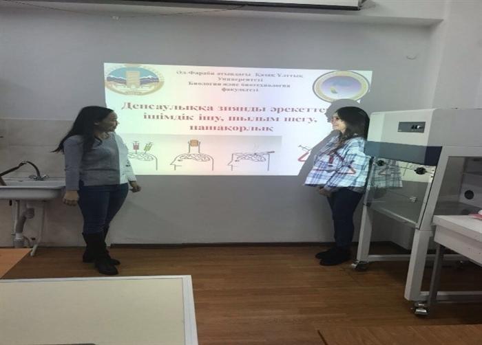 24 қараша (16.30 сағ.) және 5 желтоқсан (15.00 сағ.) 2017 жылы Биология және биотехнология факультеті, Биотехнология кафедрасының «5В070100 - Биотехнология» мамандығының 1, 2, 4 курс студенттері «Салауатты өмір салтын ұстану» бағдарламасы аясында «Зиян әдеттер» тақырыбында дискуссиялық алаң өткізді.