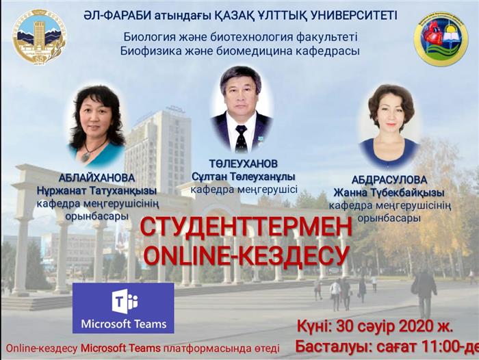 Ағымдағы жылдың 30 сәуірінде сағат 11.00-де Microsoft Teams платформасында биофизика және биомедицина кафедрасының ПОҚ онлайн режимінде жазғы емтихан сессиясын қашықтықтан өткізу мәселелері бойынша кездесу өткізеді.