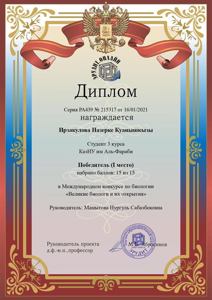 «Биотехнология» мамандығының 3 курс студенті Ирзакулова Назерке Қуанышқызы «Ұлы биологтар және олардың ашқан жаңалықтары» биология пәнінен халықаралық байқауда Дипломмен (1 орын) марапатталды
