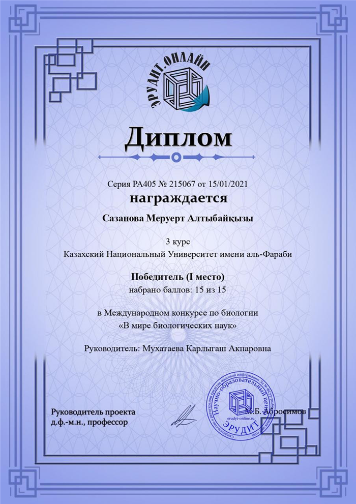 «Биотехнология» мамандығының 3 курс студенті Сазанова Меруерт Алтыбайқызы биология пәнінен «Биология ғылымдары әлемінде» халықаралық байқауында Дипломмен (1 орын) марапатталды