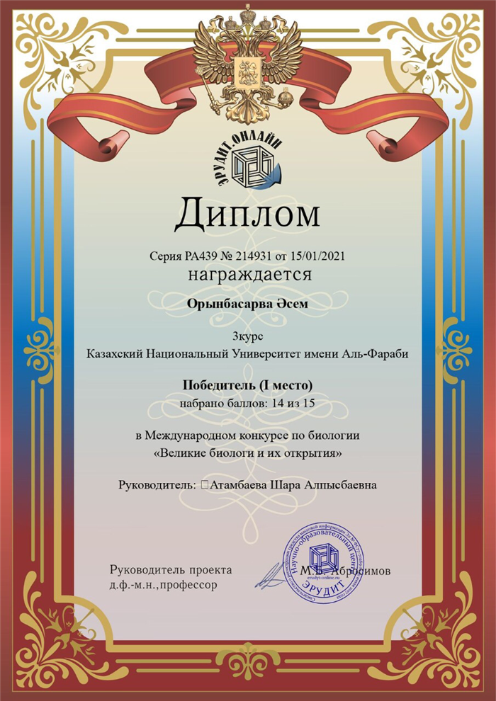 «Биотехнология» мамандығының 3 курс студенті Орынбасарова Асем биология пәнінен «Ұлы биологтар және олардың ашқан жаңалықтары» халықаралық байқауында Дипломмен (1 орын) марапатталды