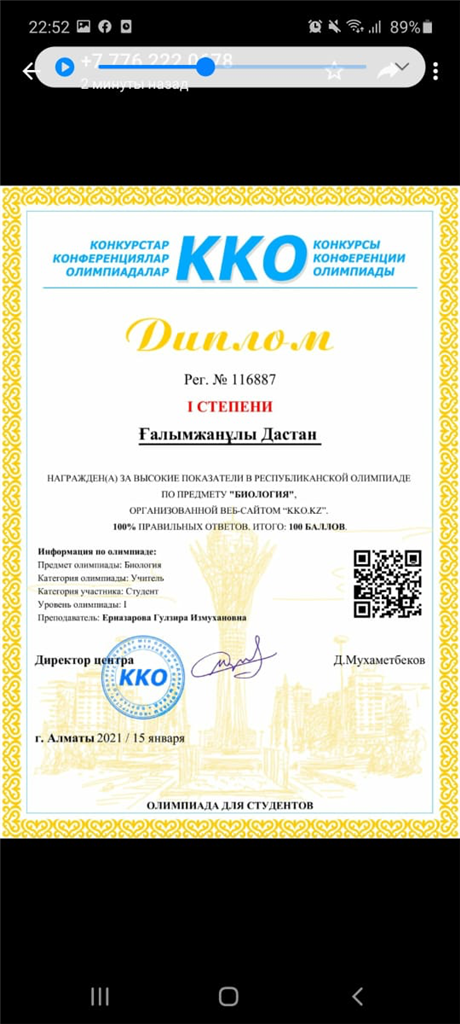 «Биотехнология» мамандығының студенті Ғалымжанұлы Дастан «Биология» пәнінен www.kko.kz вебсайты ұйымдастырған Республикалық Олипиадада Дипломмен (1-орын) марапатталды
