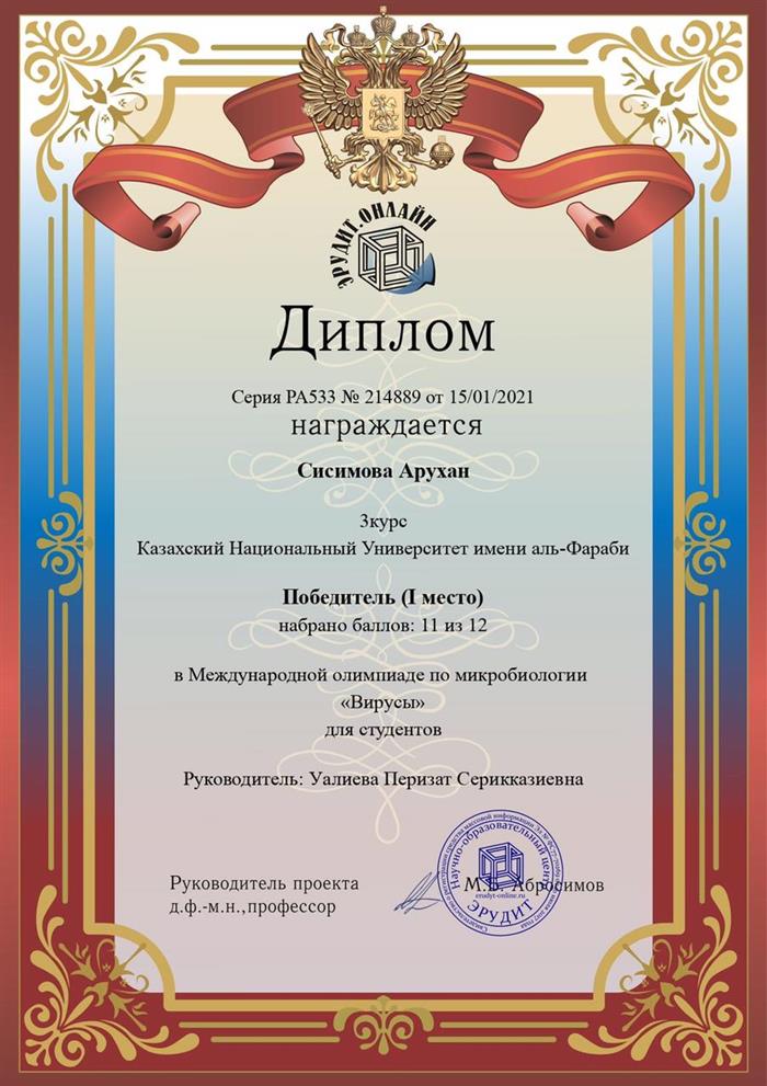 «Биотехнология» мамандығының 3-курс студенті Сисимова Арухан Микробиология пәнінен «Виустар» тақырыбында ұйымдастырылған халықаралық Олипиадада Дипломмен (1-орын) марапатталды