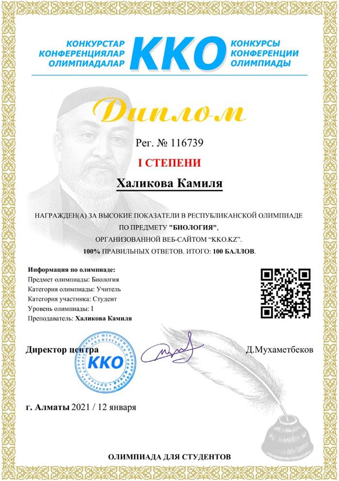 «Биотехнология» мамандығының 1-студенті Халикова Камиля Нурлановна «Биология» пәнінен "KKO.KZ" вебсайты ұйымдастырған Республикалық Олипиадада 1-Дәрежелі Дипломмен марапатталды (Рег. №116739), Эдвайзер – б.ғ.д., профессор Атабаева С.Д.