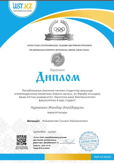 Нұрмахан Жандар Әлайдарұлы - «Биотехнология» мамандығының 4 курс студенті Республикалық Биология пәнінен студенттер арасында олимпиадасының жеңімпазы - II дәрежелі Диплом, № X-0136068, 24.10.2020 ж. - ғылыми жетекші Кайырманова Г.К.