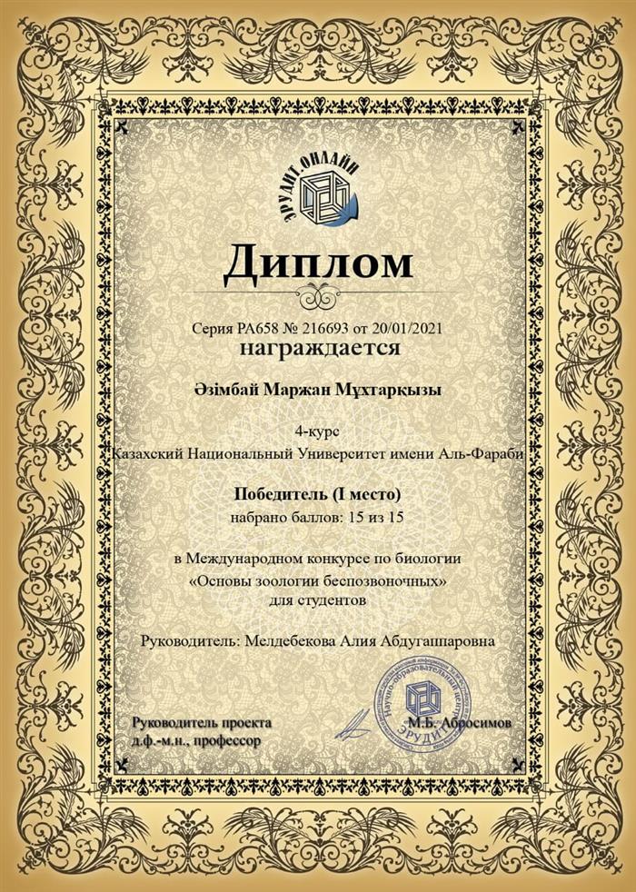 «Биотехнология» мамандығының 4 курс студенті Әзімбай Маржан Мұхтарқызы «Омыртқасыздар зоологиясынының негіздері» биология пәнінен халықаралық байқауда Дипломмен (1 орын) марапатталды (Cерия РА 658 #216693 от 20.01.2021). Эдвайзер – б.ғ.к. Мелдебекова А.А.