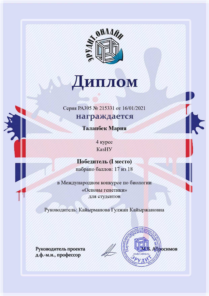 Талапбек Мария, «Биотехнология» мамандығының 4 курс студенті, Биология пәнінен «Генетика негіздері» студенттер арасында Халықаралық Олимпиаданың жеңімпазы - 1 дәрежелі Диплом Сериясы (РА395 №215331) 27.01.2021 ж. - ғылыми жетекші Кайырманова Г.К.