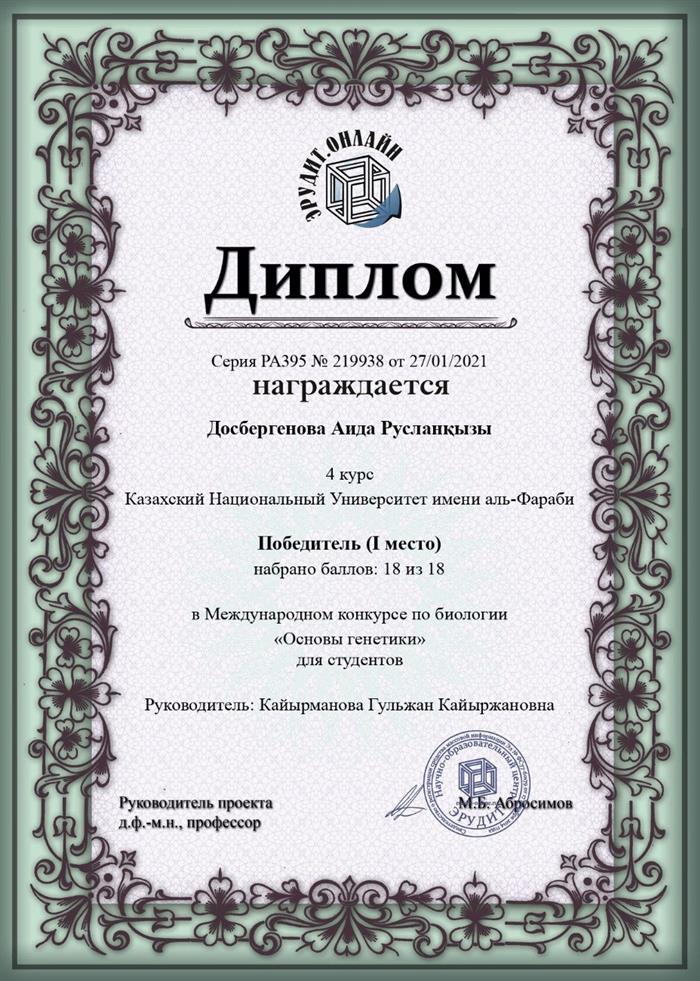 Досбергенова Аида Русланқызы, «Биотехнология» мамандығының 4 курс студенті, Биология пәнінен студенттер арасында Халықаралық Олимпиаданың жеңімпазы - 1 дәрежелі Диплом (РА395 №219938) 27.01.2021 ж. - ғылыми жетекші Кайырманова Г.К.
