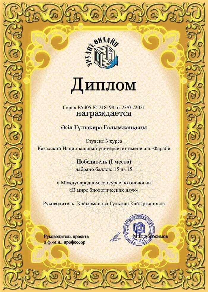 Әсіл Гүлзакира - «Биотехнология» мамандығының 3 курс студенті, Биология пәнінен студенттер арасында Халықаралық Олимпиаданың жеңімпазы - 1 дәрежелі Диплом (РА405 №218198) 23.01.2021 ж. - ғылыми жетекші Кайырманова Г.К.