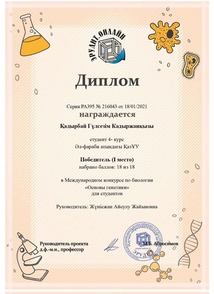 «Биотехнология» мамандығының 4 курс студенті Қадырбай Гүлсезім Қадыржанқызы биология пәнінен «Генетика негіздері» халықаралық байқауында Дипломмен (1 орын) марапатталды