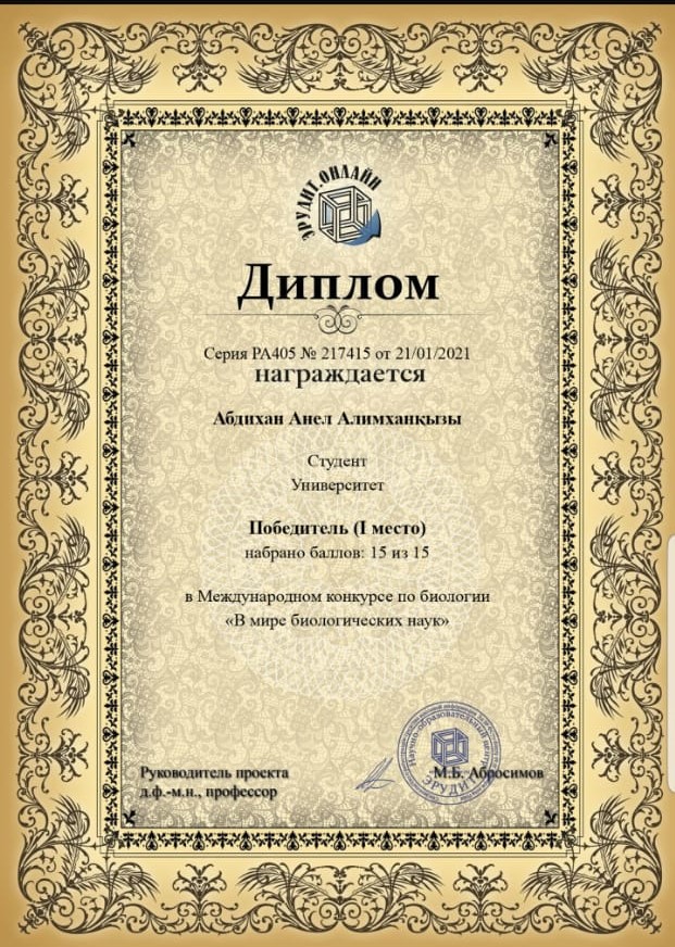 «Биотехнология» мамандығының 3 курс студенті Абдихан Анель биология пәнінен «Биологиялық ғылымдар әлемінде» халықаралық байқауында Дипломмен (1 орын) марапатталды. Куратор-эдвайзер Атамбаева Ш.А.
