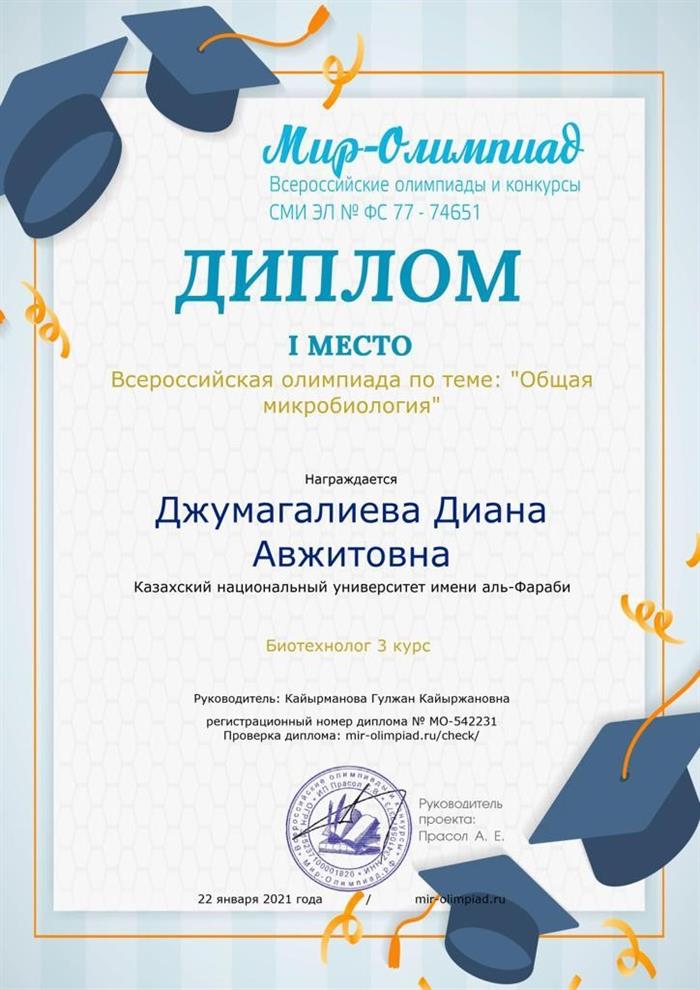 Джумагалиева Диана Авжитовна, «Биотехнология» мамандығының 3 курс студенті. «Жалпы микробиология» пәнінен студенттер арасында Бүкілресейлік Олимпиадасының 1 дәрежелі Диплом жеңімпазы (№ МО 542231 ), 22.01.2021 ж. - ғылыми жетекші Кайырманова Г.К.