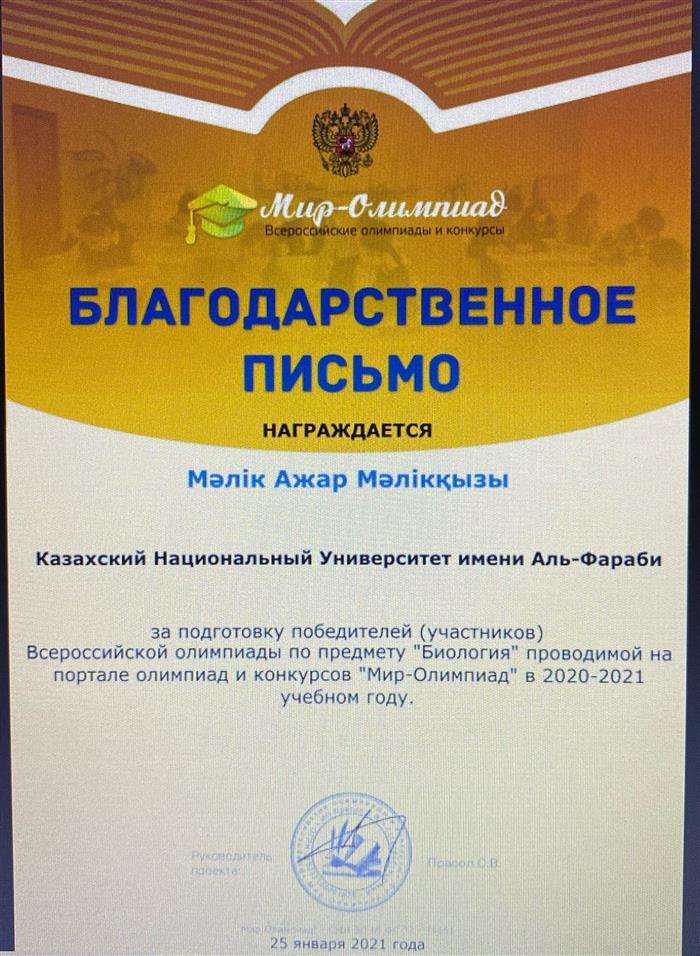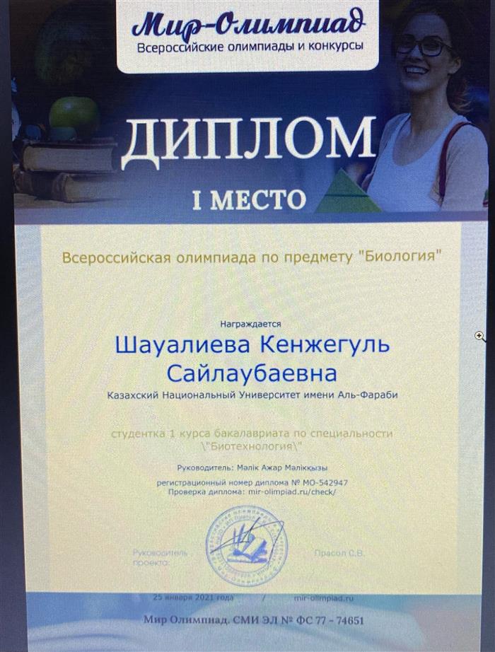 Шауалиева Кенжегуль Сайлаубаевна, «Биотехнология» мамандығының 1 курс студенті 23.01.2021 ж. «Биология» пәнінен Бүкілресейлік Олимпиадасында Дипломмен (1-орын, № ФС 77 – 74651) марапатталды. Куратор-эдвайзер Мәлік Ажар Мәлікқызы