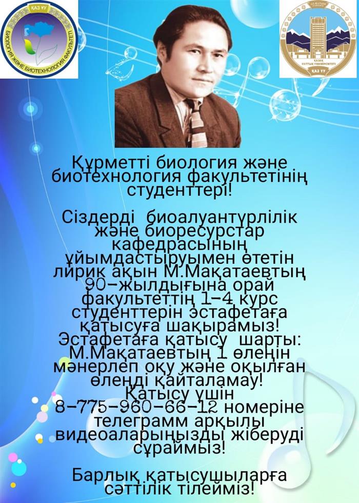 🔴Сіздерді биоалуантүрлілік және биоресурстар кафедрасының ұйымдастыруымен лирик ақын М.Мақатаевтың 90-жылдығына орай факультеттің 1-4 курс студенттерін эстафетаға қатысуға шақырамыз!