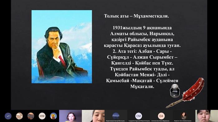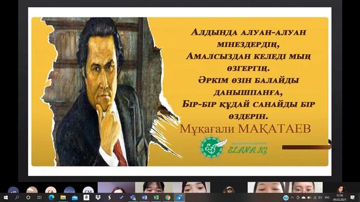 5 наурыз 2021 ж. Биология және биотехнология факультетінің Биотехнология кафедрасында 3 курс студенттерінің (БT18-17, БT18-31) және эдвайзер Атамбаева Ш.А. қатысуымен, қазақ ақыны Мұқағали Мақатаевтың 90 жылдығына арналған "Қазақтың ақиық ақыны – Мұқағали Мақатаевтың 90-жылдығы" онлайн-ісшара өтті. Іс-шараға Ережепов А.Е., Сарсекеева Ф.К., Ерназарова Г.И., Нармуратова М.Х. кафедра оқытушылары қатысты. Бұл іс-шараның мақсаты қазақстандық патриотизмге тәрбиелеу болды. Оқушылар Мұқағали Мақатаевтың жеке басының маңыздылығын, оның жан-жақты талантын көрсетті. Студенттер қызықты презентация дайындады, ол іс-шара қонақтарын ақынның өмірі мен шығармашылығымен таныстырды және іс-шара барысында қатысушылар ақынның өлеңдерін оқыды, көптеген таныс шығармаларды орындады.
