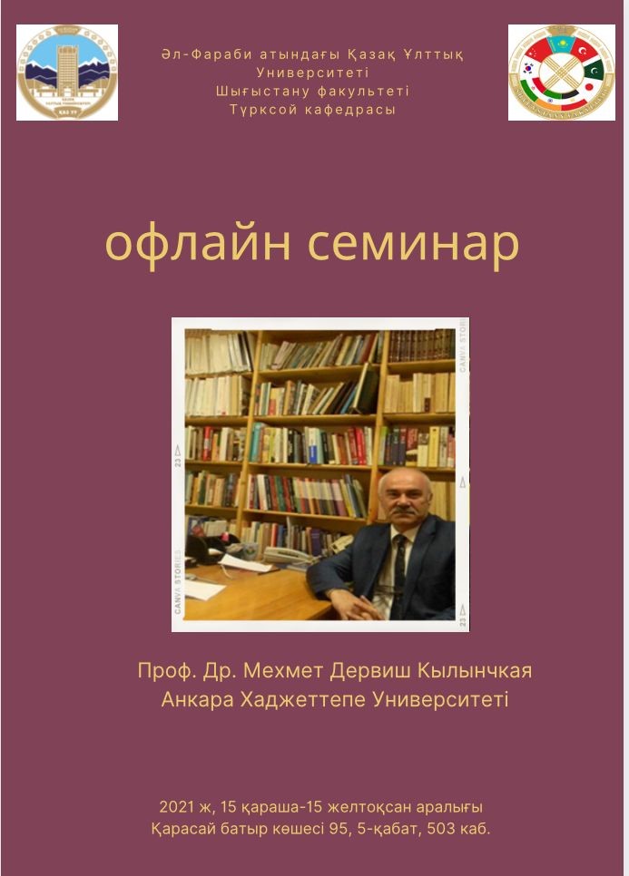 Шығыстану факультеті, Түрксой кафедрасында бір айлық дәстүрлі түрде өтетін семинарлар басталды. Семинардың лекторы Проф. Др. Мехмет Дервиш Кылынчкая (Анкара Хаджеттепе). Семинардын темасы қазіргі түрік тарихы (19. ғасырдын аяғы-21 ғасыр). Семинарлар 15 қарашадан басталып 15 желтоқсанға дейін өтеді және тыңдаушыларға сертификат беріледі. Дәрістердің өтілетін адресі Қарасай батыр көшесі 95, 5- қабат, 503 аудитория.
