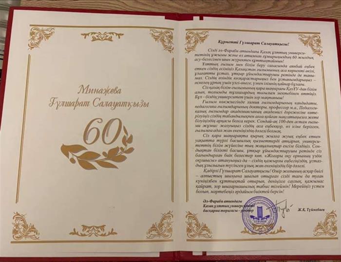 Кафедрамыздың профессоры Минажева Г.С. 60 жылдық мерейтойына орай ҚазҰУ дамуына қосқан үлесі үшін "Ерен еңбегі үшін" медалімен марапатталды!
