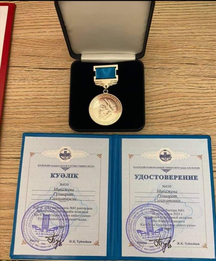 Кафедрамыздың профессоры Минажева Г.С. ҚазҰУ дамуына қосқан үлесі үшін "Ерен еңбегі үшін" медалімен марапатталды!