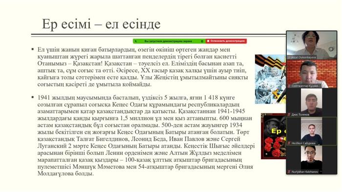 2021 жылдың 19 сәуірі күні, Филология және әлем тілдері факультеті шет тілі кафедрасының аға-оқытушысы: Дуйсенбаева Ш.С. ұйымдастыруымен, қазақ және ағылшын тілдерінде Ұлы Отан соғысының Жеңіс күніне арналған «Ер есімі – ел есінде» атты, үлкен көлемде онлайн іс-шара өтті. Онлайн іс-шараға Әл-Фараби атындағы Қазақ Ұлттық Университетінің және Қ. Сәтпаев атындағы Қазақ ұлттық техникалық зерттеу университетінің 1 курс студенттері қатысты.